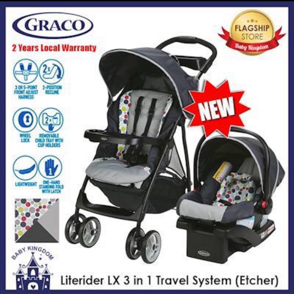 Graco FastAction Fold SE Travel System with SnugRide Infant Car Seat. It is also very much appreciated by most parents. The Graco LiteRider LX Travel System features an ultra-lightweight fully featured stroller and Gracos SnugRide 30 Click Connect Infant Car Seat. Also see scores for competitive products. Gracos LiteRider LX stroller features an ultra-lightweight stroller that is compatable with any Graco Click Connect Infant Car Seat. This Graco stroller accepts all Graco Click Connect infant car seats with a secure one-step attachment to create your own travel system. It includes the LiteRider Click Connect Stroller and the top-rated SnugRide Click Connect 30 infant car seat for a baby from 4-30 lb which connects to the stroller with a secure one-second attachment. Select items on sale. The stroller features a one-second one-hand fold with an included automatic storage lock so the stroller can stand on its own.